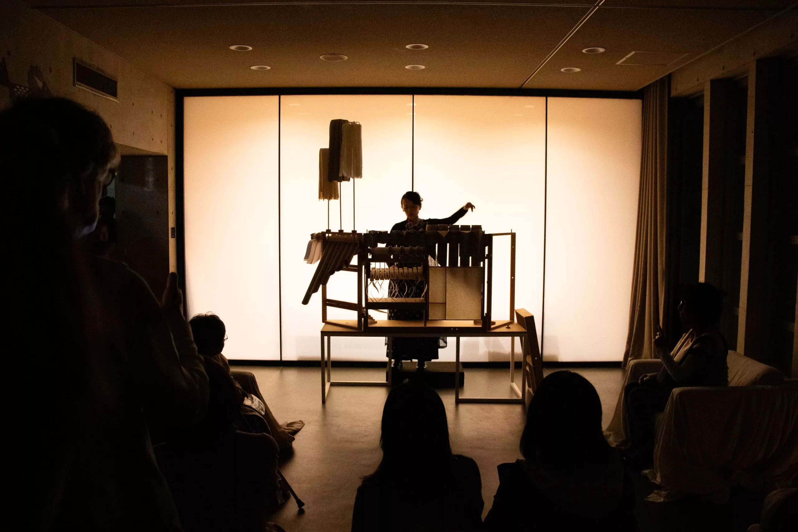 Dans chacun de ces lieux, l’orgue peut être activé de deux manières : d’une part par l’intervention d’une percussionniste qui en révèle les textures sonores ; d’autre part comme accompagnement musical à la narration de contes issus du Kojiki. Pour cette performance, l’actrice et chanteuse Muriel Marschal a réécrit et adapté des épisodes de la mythologie japonaise afin qu’ils entrent en résonance avec l’Orgue de papier, créant une forme immersive où texte et son dialoguent étroitement. Support de transmission, de mémoire et de souffle, le papier devient ici l’instrument d’un rituel de réactivation des mythes fondateurs. Aux côtés de Muriel Marschal, François-Xavier Richard s’entoure de deux artistes japonaises pour faire vivre l’Orgue de papier : l’actrice Emi Ogura, dont la voix incarne la version japonaise de cette réinterprétation du Kojiki, et la percussionniste Asuka Hatanaka, collaboratrice de longue date, qui fait vibrer et résonner le son du papier.